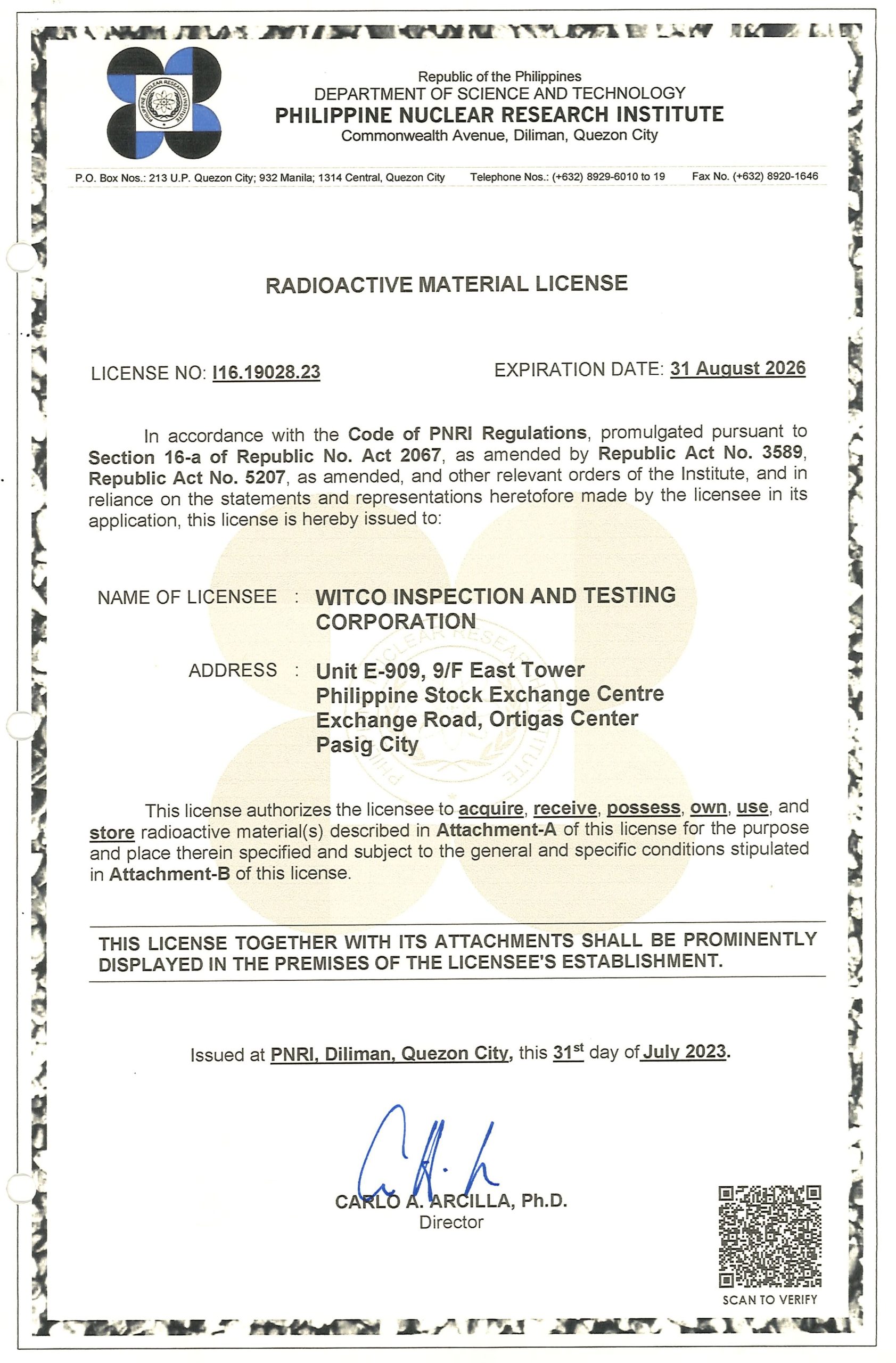 We are duly licensed by the Philippine Nuclear Research Institute (PNRI) to use and handle radioactive materials for the conduct of Industrial Radiography. In compliance with national regulatory standards, we implement strict safety protocols to ensure the protection of our personnel, the environment, and the general public.